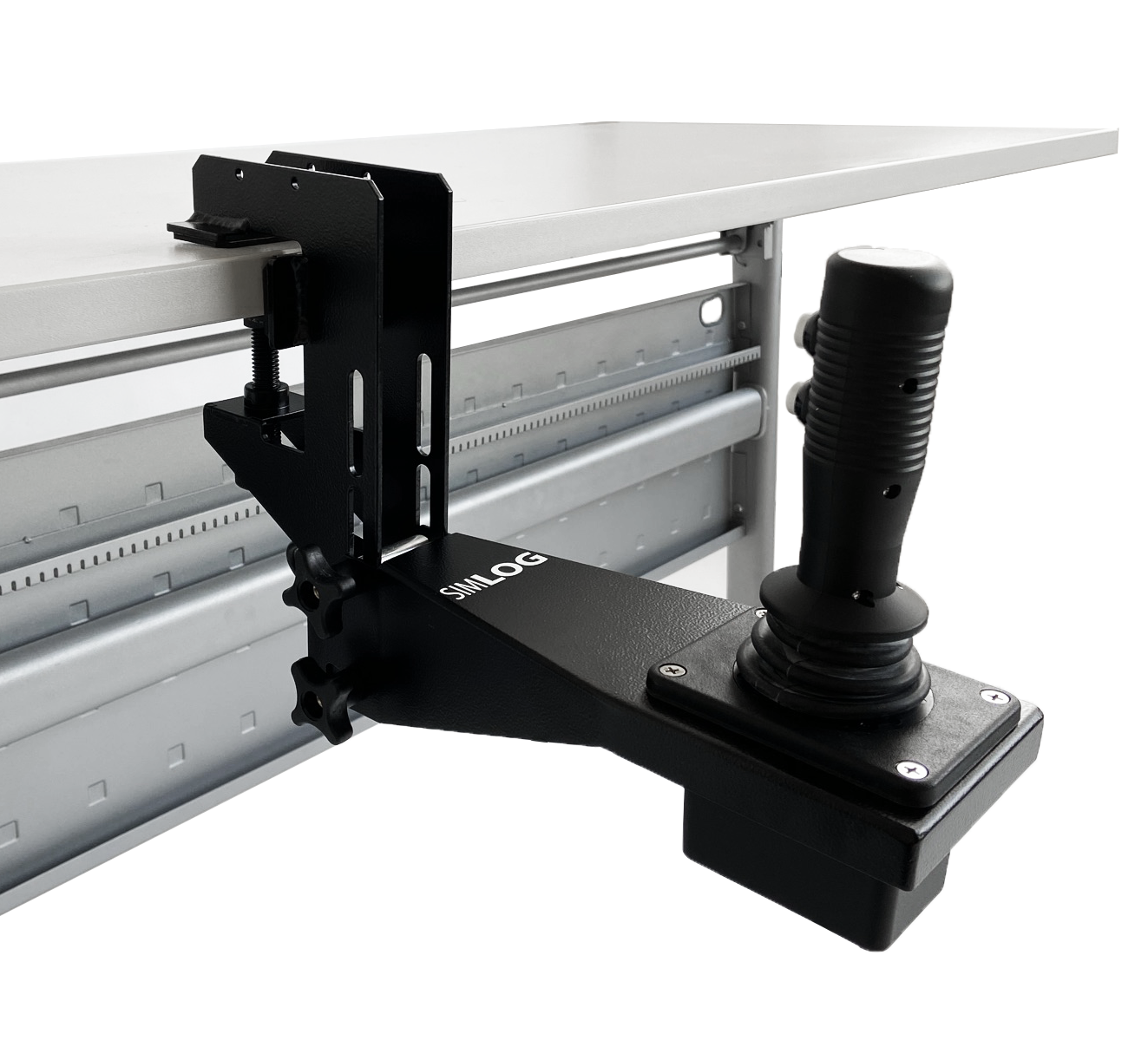 The setup includes two industrial joysticks with integrated electronics and multiple push-buttons for viewpoint control, along with optional tabletop mounting brackets for ergonomic positioning. To complete the system, users can add a USB-compatible steering wheel, 3-pedal unit, and Transmission Replica Control Lever.