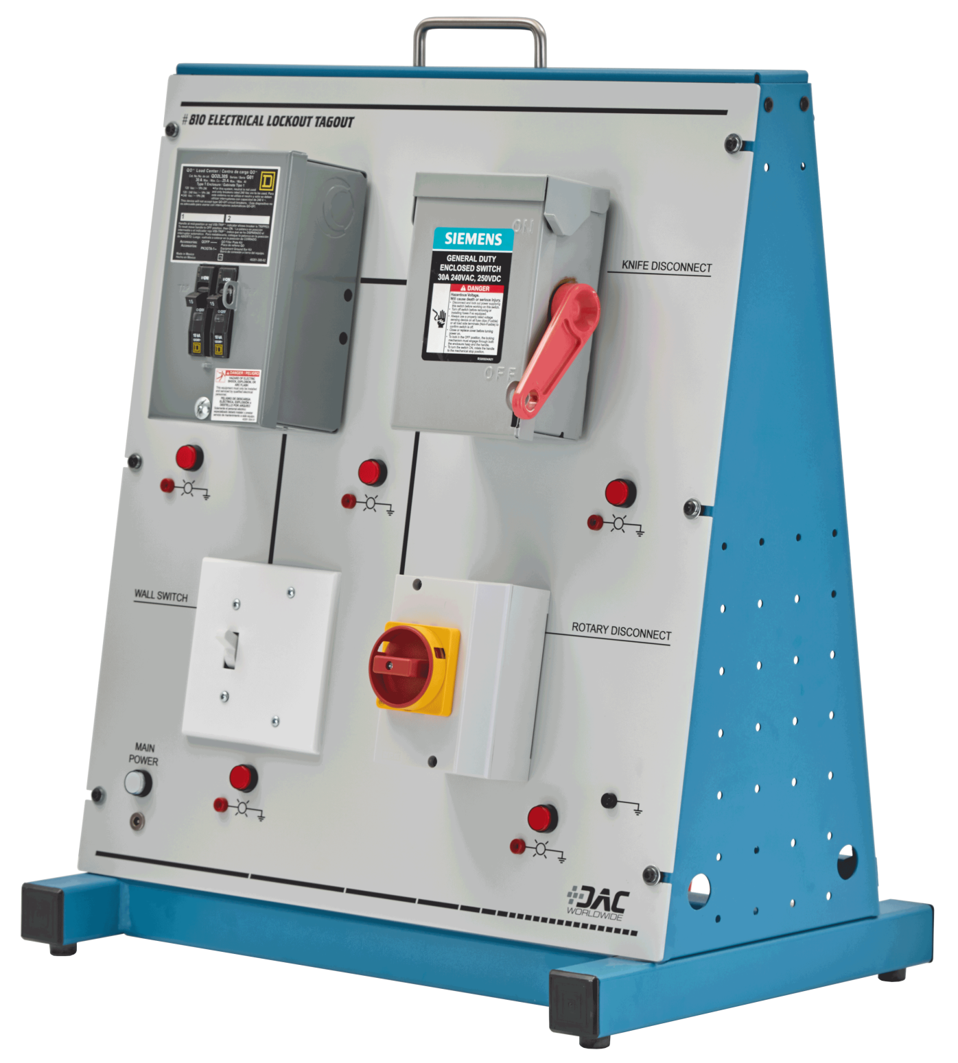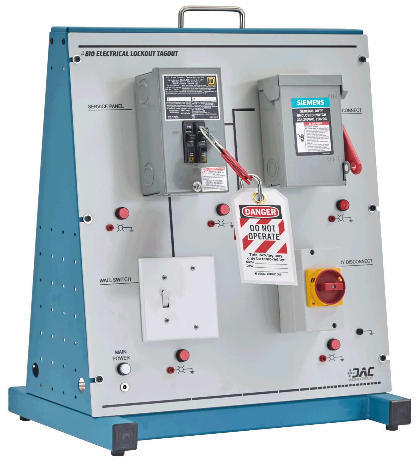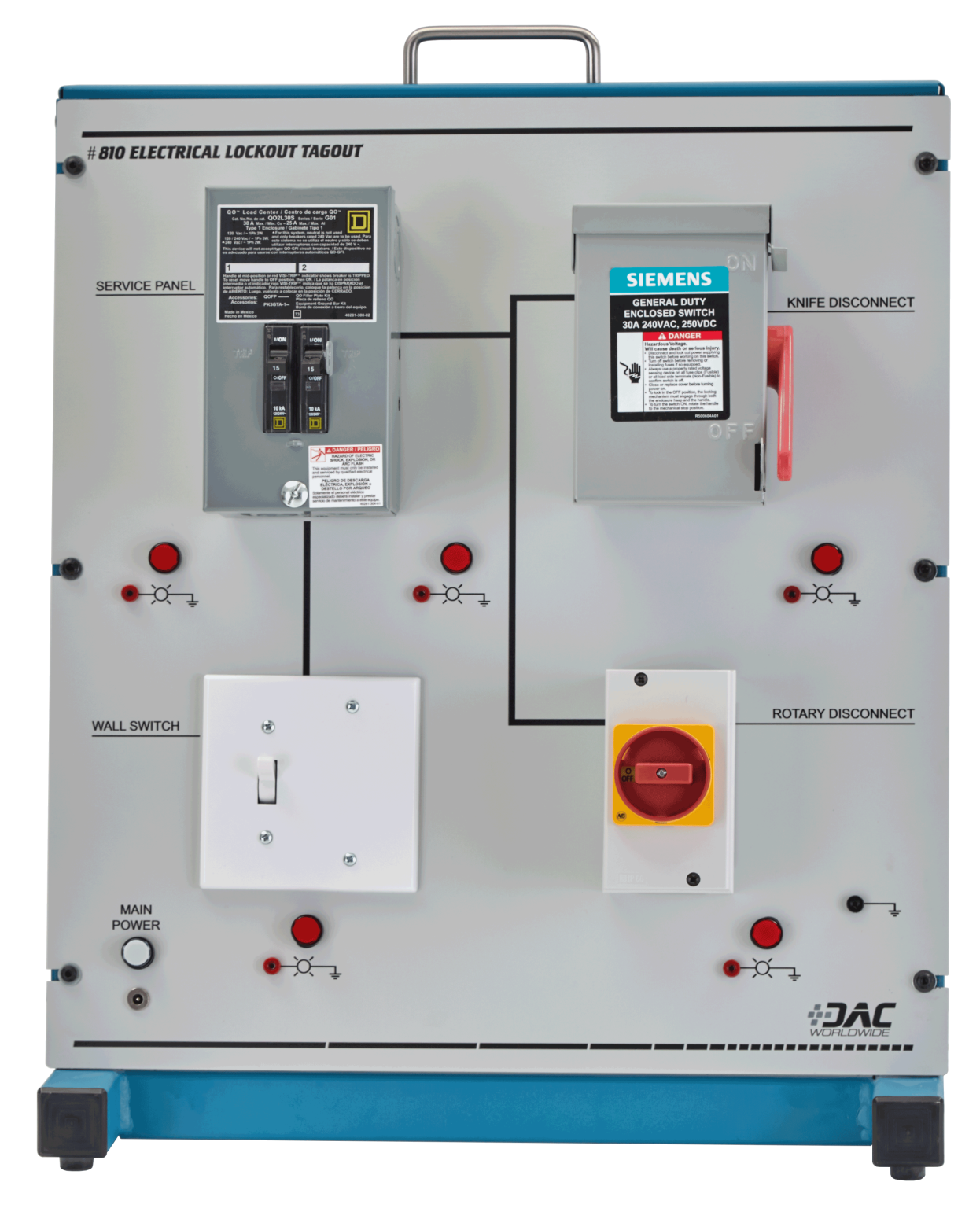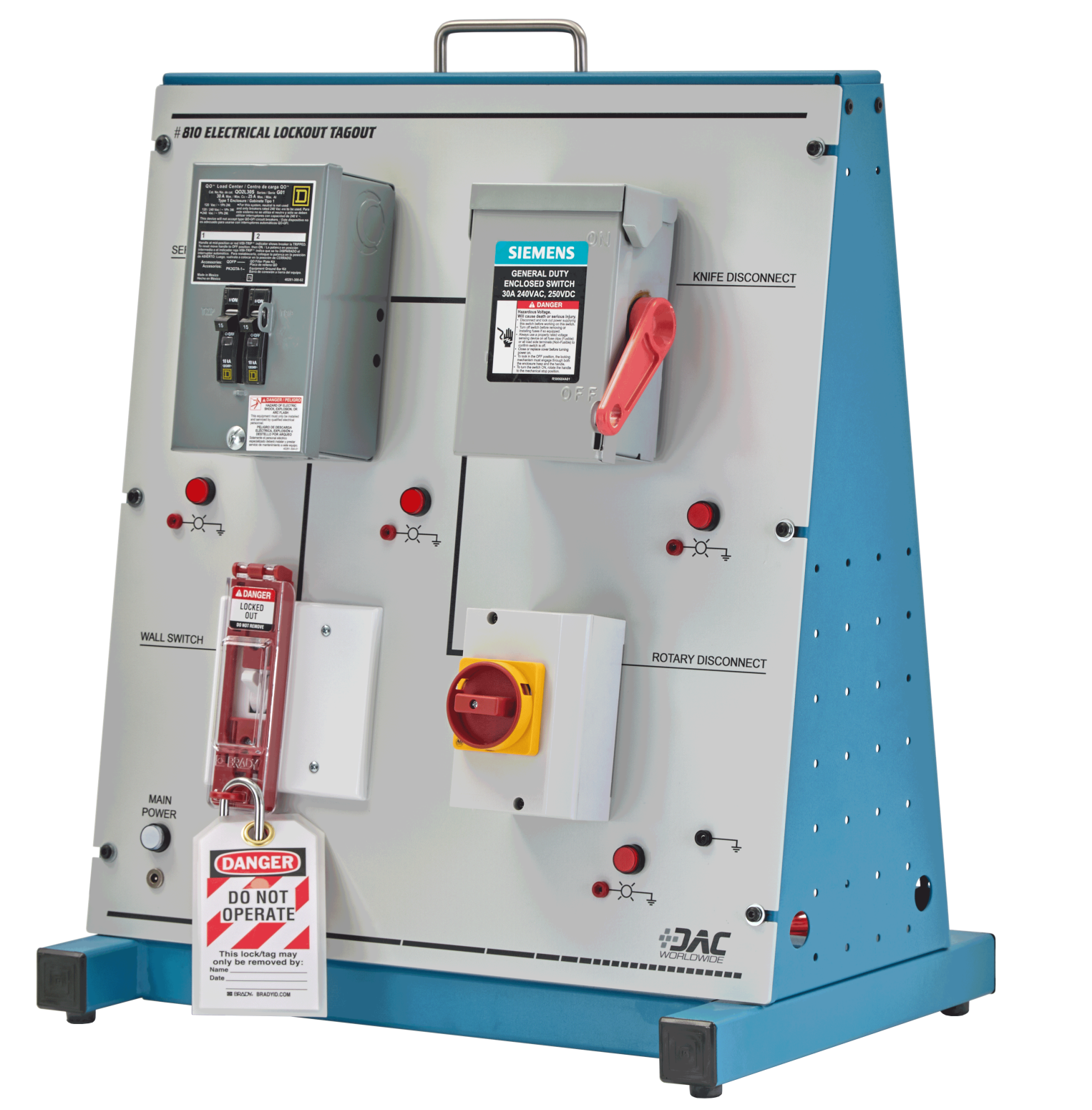 DAC Worldwide’s Electrical Lock-Out/Tag-Out Training System (810-000) provides a practical, hands-on approach to teaching these essential safety skills. This affordable, portable tabletop trainer is designed for use in industrial settings to teach the identification and lock-out of hazardous electrical energy sources, all while maintaining user safety with a reduced voltage of 24VDC.
