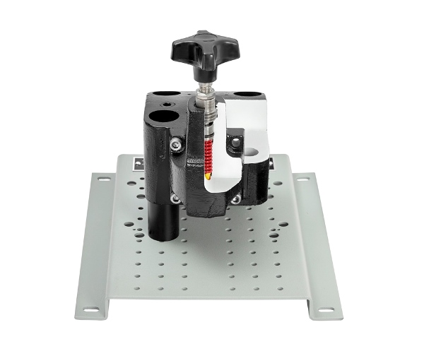 Thanks to carefully planned sectioning, the complete internal configuration of this hydraulic relief control valve can be seen, while allowing for disassembly for more complete inspection and convenient classroom training in the operation, construction, and maintenance of these common pieces of hydraulic equipment. This professionally-crafted, yet-economical component sample will enhance fluid power training activities in both the industrial and the educational setting.