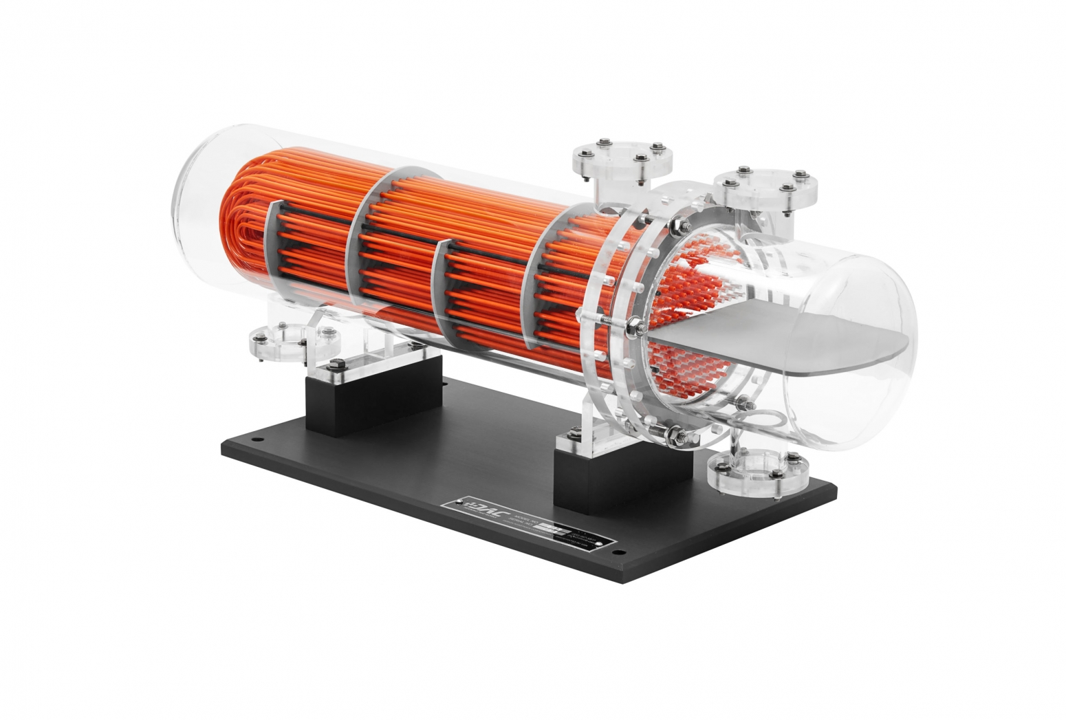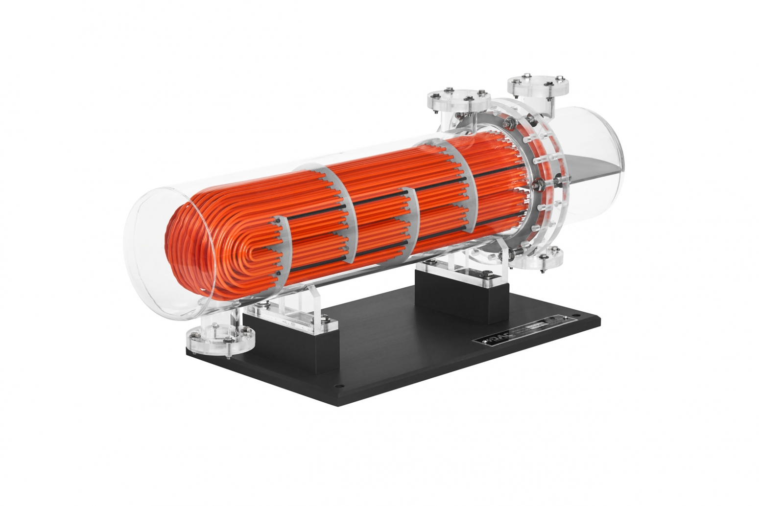 The model features clear acrylic components, a removable tube bundle, color coding, and realistic detail, which combine to make this a useful tool in both operations and maintenance training of industrial heat exchangers. The model can also be completely disassembled and incorporates cut-away areas illustrating the flow path.
