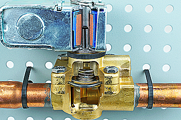A full cutaway view of the valve body and actuator area exposes the complete internal design, flow path, disc, seat, spring, and sealing O-ring, as well as the activating coil. Cutaway surfaces are enhanced through painting, making the geometry of all components more clear. Multiple cutaways unveil all internal components, which enhances classroom training in HVAC system design, maintenance, troubleshooting, and preventive/predictive maintenance.