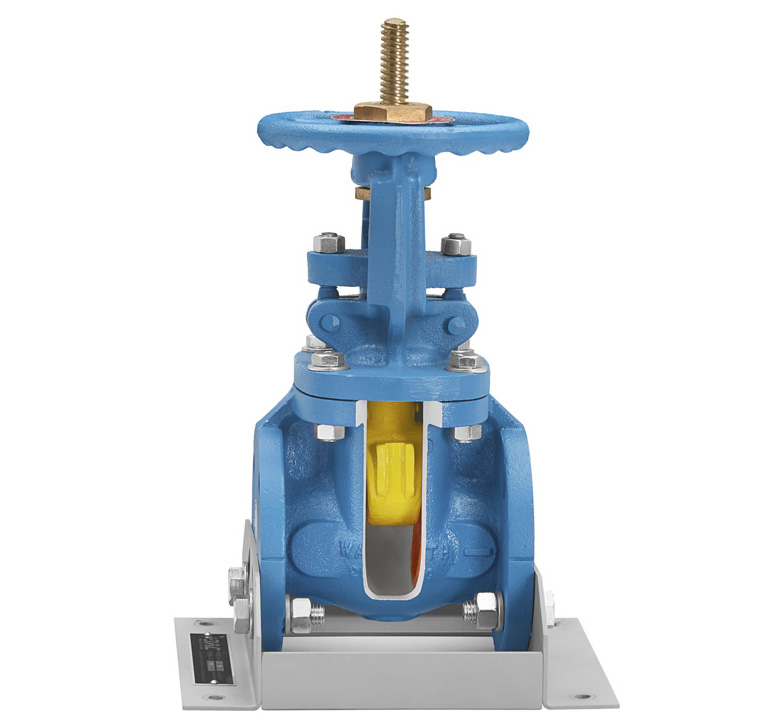 This industrial piping training component is a carefully sectioned gate valve that features color-coding of valve body, internal surfaces, seat, and closure devices, using contrast colors.