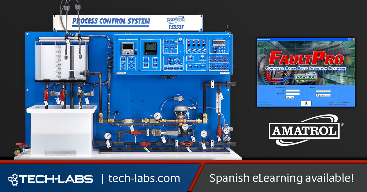 Amatrol’s Process Control Troubleshooting Training System uses FaultPro, the industry’s only electronic troubleshooting system, to offer hands-on troubleshooting skills like in-circuit component testing methods and universal digital controller troubleshooting. This process control training system includes the industry’s best hands-on process control troubleshooting training, covering thirty-six (36) electrical faults, six (6) mechanical faults, PID controller programming errors, flow transmitter programming errors, and I/P converter calibration errors.