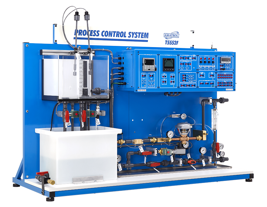 Amatrol’s Level and Flow Process Control Troubleshooting Learning System (T5552F) covers calibration, installation, operation, and troubleshooting for flow and liquid level process control systems and components. The process control training system uses industry-standard components mounted and plumbed in a closed-loop circuit to provide learners with the opportunity to practice manual and automatic control of a process instrumentation system by controlling the water flow rate between two tanks or the liquid level in one tank.