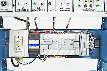 The main feature of the Basic PLC Training System is the Allen Bradley Micro850 Programmable Controller assembly. In addition, this hands-on training device allows for connection to training productions related to process control, motors/motor control, sensors, PLC applications, and fluid power.