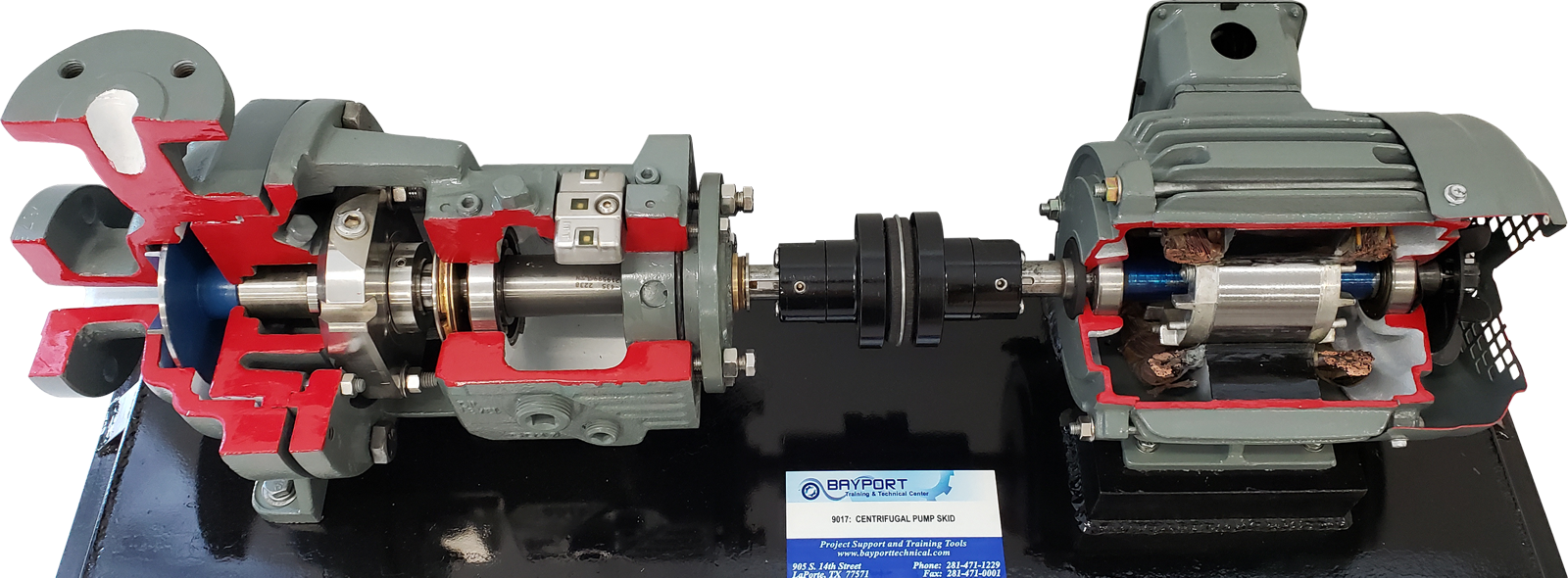 Centrifugal pumps are mechanical devices designed to move fluids through the transfer of rotational energy from one or more driven rotors, called impellers. Fluid enters the rapidly-rotating impeller along its axis and is cast out by centrifugal force along its circumference through the impeller’s vane tips. Bayport Technical's Centrifugal Pump Skid Cutaway allows individuals to see and identify the internal components of a centrifugal pump and electrical motor.