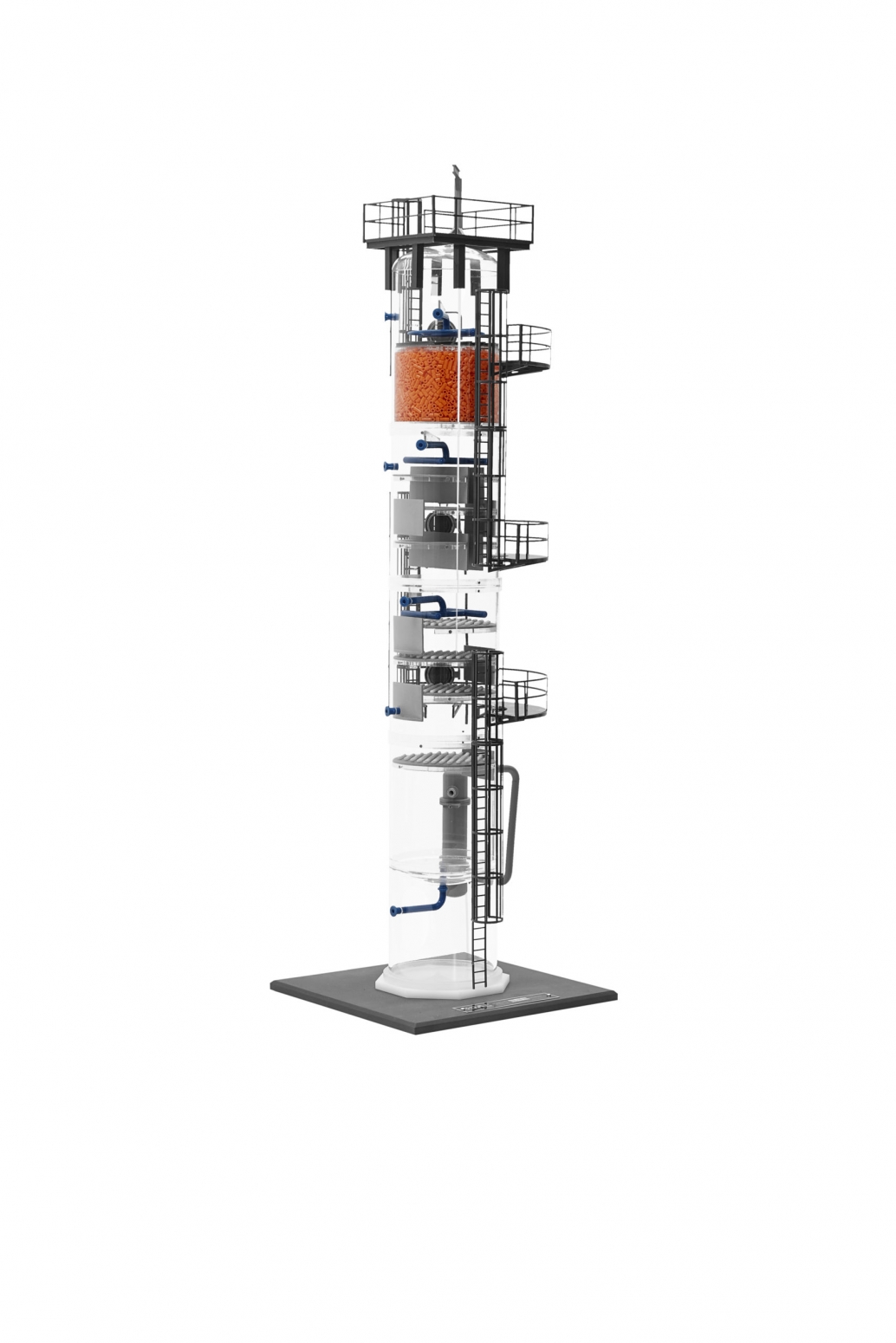 This Distillation Column Model features a clear acrylic, 5-inch diameter shell that allows complete visibility of internal components. To ensure an ideal training experience, the model also includes a durable PVC base, with provisions for tabletop mounting. All of the construction throughout the model is to-scale, and the perfect 3-dimensional solution for engineering study, promotion, and training.