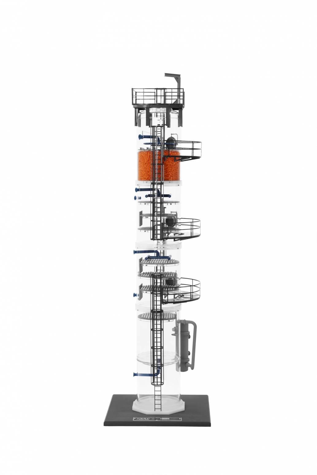 This realistic mechanical model includes internal piping/spargers, manways, nozzles, platforms, ladders, and many more industrial-grade components. Learners will use these components to study topics such as equilibrium stages, liquid and vapor distribution, total vapor pressure drop, and column/design characteristics.