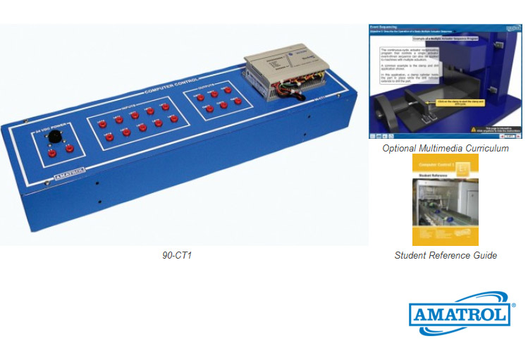 Amatrol’s Computer Control 1 Learning System (90-CT1) covers how to program, operate, and interface programmable controllers in a variety of industrial applications used in the automotive, packaging, and technological assembly industries, to name a few. The programmable controller is one of the most important developments in industrial automation because of its ability to be quickly programmed to control a wide range of industrial processes and machines. Typical applications include: robots, conveyors, electric motor controls, air conditioning, process control, plastic injection molding, and CNC machines.