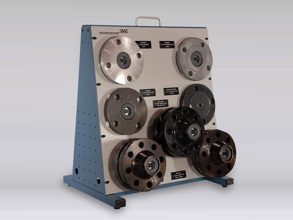 DAC Worldwide’s Flange Sample Board (864-PAC) provides a hands-on teaching aid for piping system training, pipe fitting training, and process operations training. This industrial process system training supplement includes 15 different types of flanges on two rack-mounted panels with magnetic identification tags. These industrial flanges include a variety of face types, materials, pressure ratings, and pipe connections.