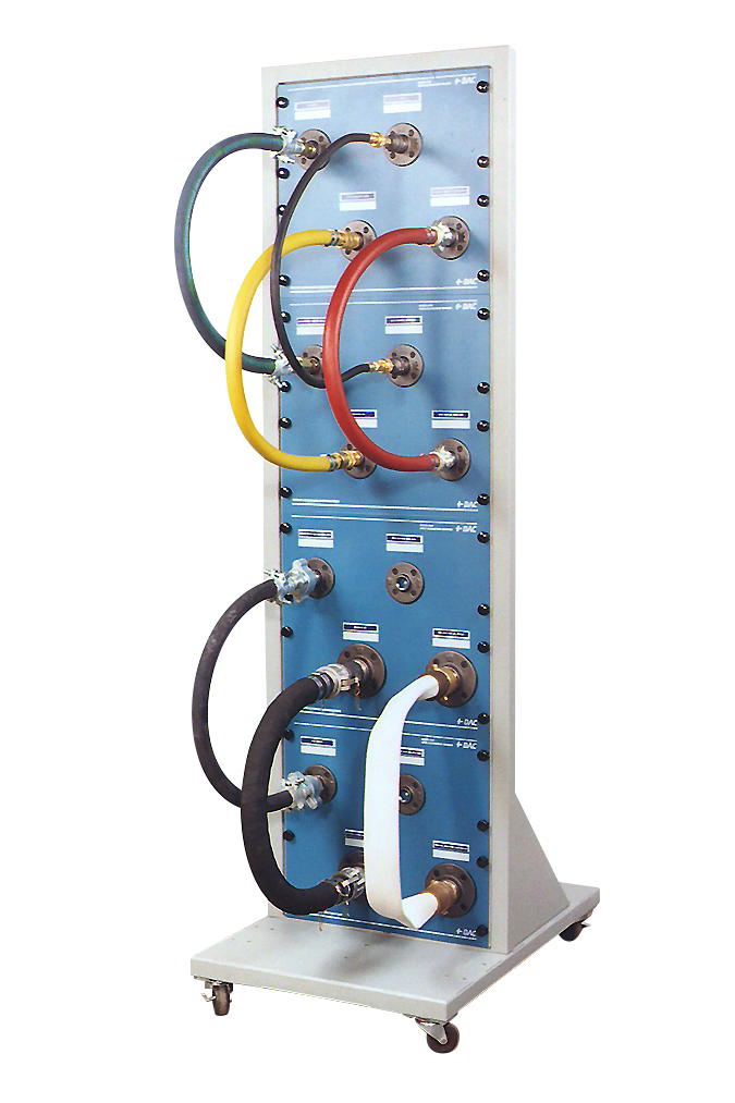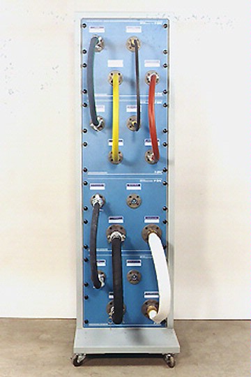 The complete sample board set includes eight (8) full-size industrial hoses depicting common utility and process connections found in the industrial setting. Each sample hose includes two (2) coupling halves appropriate for use in each service. Panels also include complementary hose coupling components, allowing for attachment of both hose ends. Additionally, the set it mounted on a rolling 19-inch rack assembly, which is included in this package.