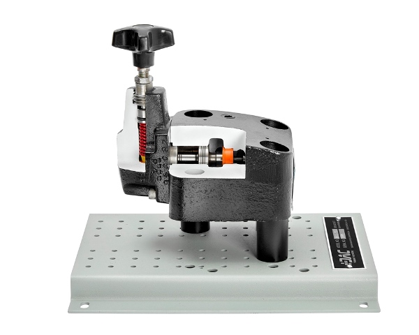 Thanks to carefully planned sectioning, the complete internal configuration of this hydraulic relief control valve can be seen, while allowing for disassembly for more complete inspection and convenient classroom training in the operation, construction, and maintenance of these common pieces of hydraulic equipment. This professionally-crafted, yet-economical component sample will enhance fluid power training activities in both the industrial and the educational setting.