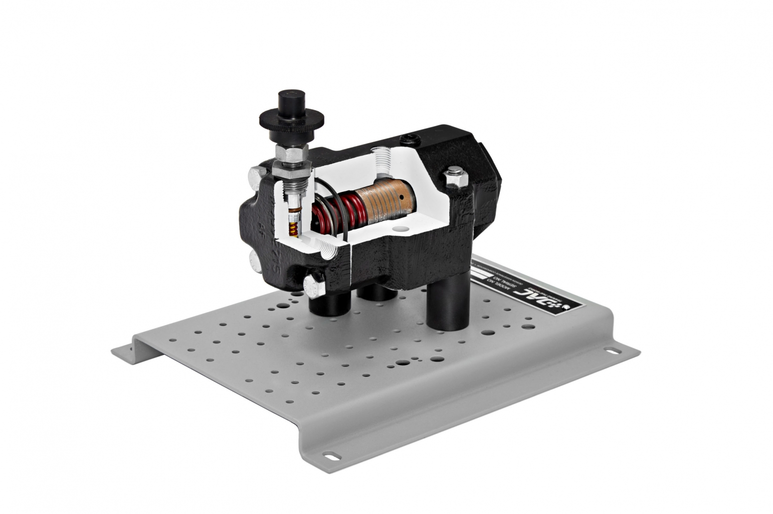 Thanks to carefully planned sectioning, the complete internal configuration of this hydraulic sequence control valve can be seen, while allowing for disassembly for more complete inspection and convenient classroom training in the operation, construction, and maintenance of these common pieces of hydraulic equipment. This professionally-crafted yet-economical component sample will enhance fluid power training activities in both the industrial and the educational setting.