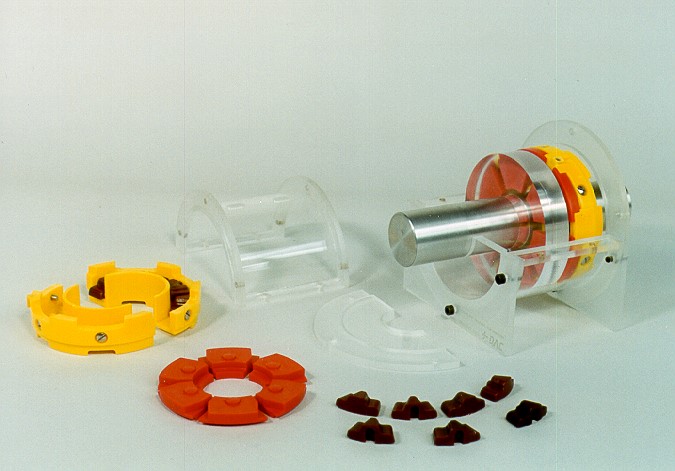DAC Worldwide's Kingsbury Thrust Bearing Model (209) is a plastic facsimile of a Kingsbury fluid film thrust bearing that allows for classroom instruction in the design, maintenance, and application of fluid film bearings used in industry. Kingsbury thrust bearings are used to transmit or absorb significant thrust in mechanical drive applications. Metallic shoes within the bearing tilt to form wedges between the shaft collar and bearing housing.