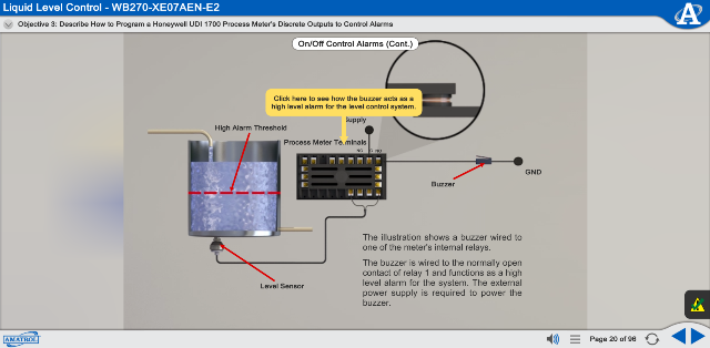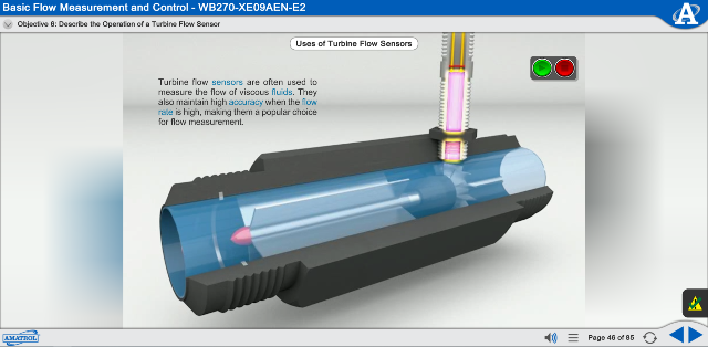 The interactive multimedia process control training course covers process control instrumentation, industrial safety rules, instrument tags, piping and instrumentation diagrams, and level measurement, then moves into system control functions such as liquid level control, automatic control methods, basic flow measurement and control, and control loop performance. The curriculum concludes with extensive component and system-level troubleshooting training.