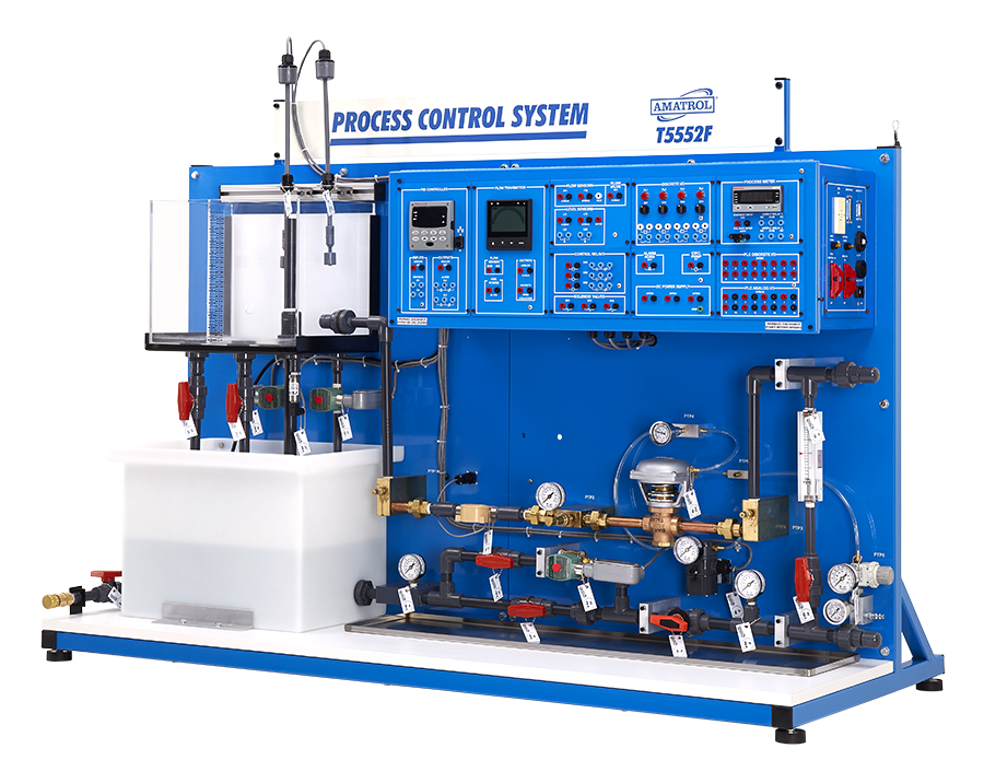 Amatrol’s Level and Flow Process Control Troubleshooting Learning System (T5552F) covers calibration, installation, operation, and troubleshooting for flow and liquid level process control systems and components. The process control training system uses industry-standard components mounted and plumbed in a closed-loop circuit to provide learners with the opportunity to practice manual and automatic control of a process instrumentation system by controlling the water flow rate between two tanks or the liquid level in one tank.
