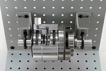 This mechanical clutch cutaway has been restored, and cut-away, unveiling the principle of operation. The device is mounted on a modular, heavy-gauge steel baseplate and support assembly, and it can be mounted on related DAC benches, workstations, displays, and storage products.
