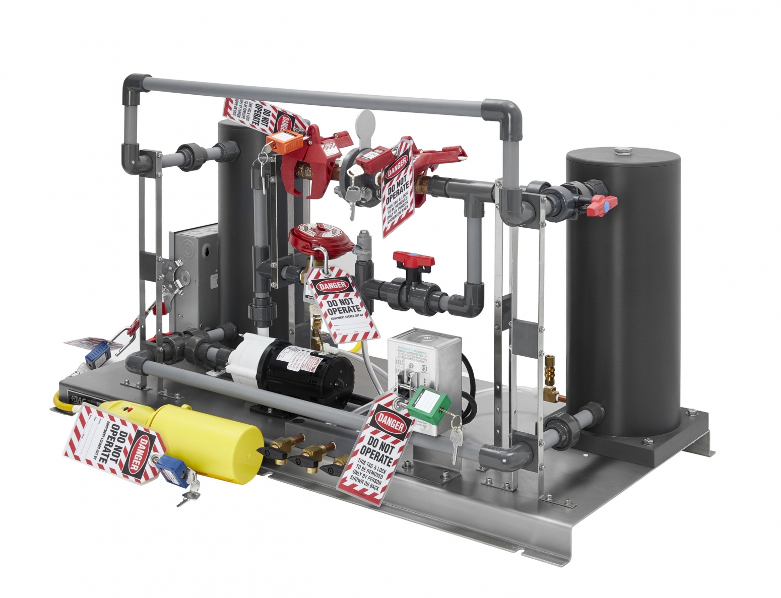 The training system includes two process tanks; a centrifugal pump; a complex, multi-purpose piping network; electrical controls; and a variety of lockable system components. A lock-out/tag-out kit that features a large number of commonly-encountered locking and tagging devices is also included.