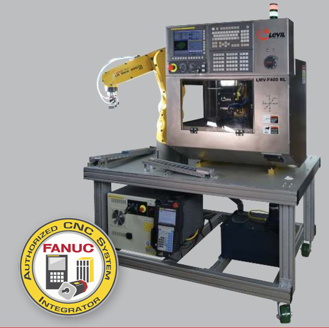 With the LMV-F400RL you will get out top of the line LMV-F400 Milling Machine along with an attached FANUC LR Mate 200iD Robot arm. Levil has created an all-in-one production center. You will have the ability to load a roller conveyor with parts that need to machined, from there, just let the robot feed the milling machine with part after part while the operator is free to work on other projects, only returning to reload the conveyor and unload finished parts. This machine is also a great teaching tool in that an instructor has everything they need to educate students on both Robot programming as well and CNC machining with one machine.
