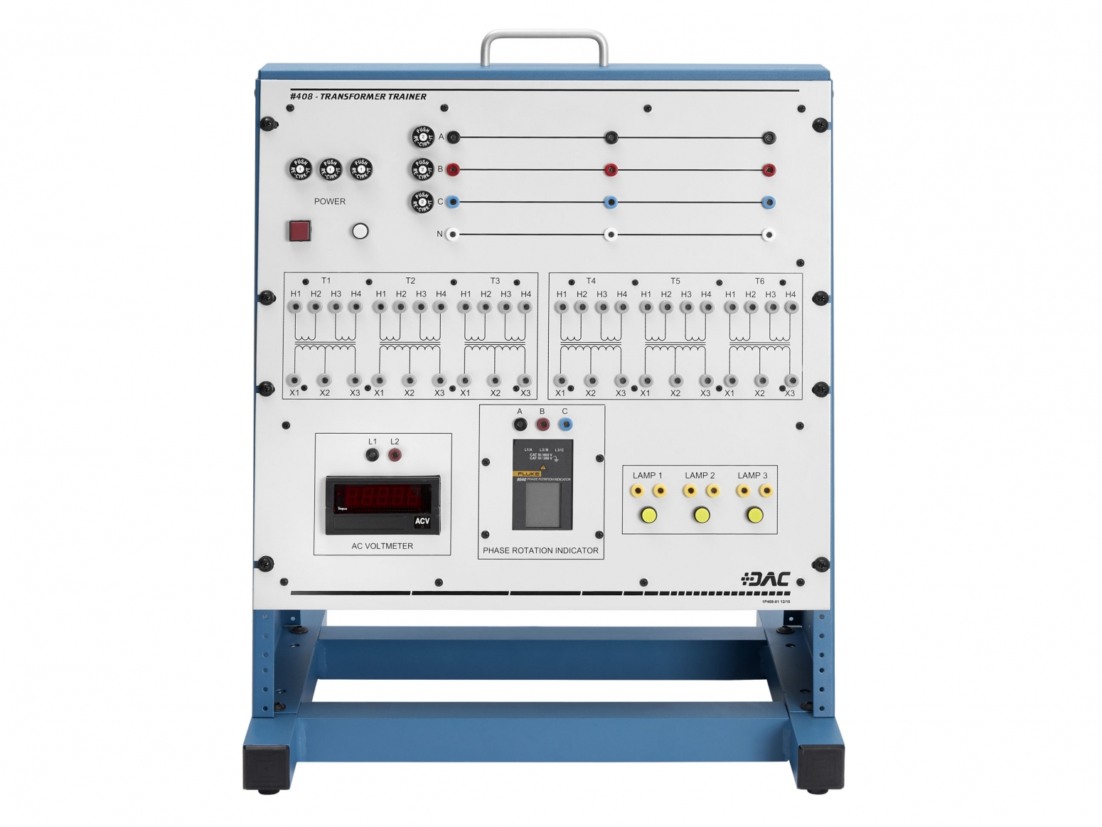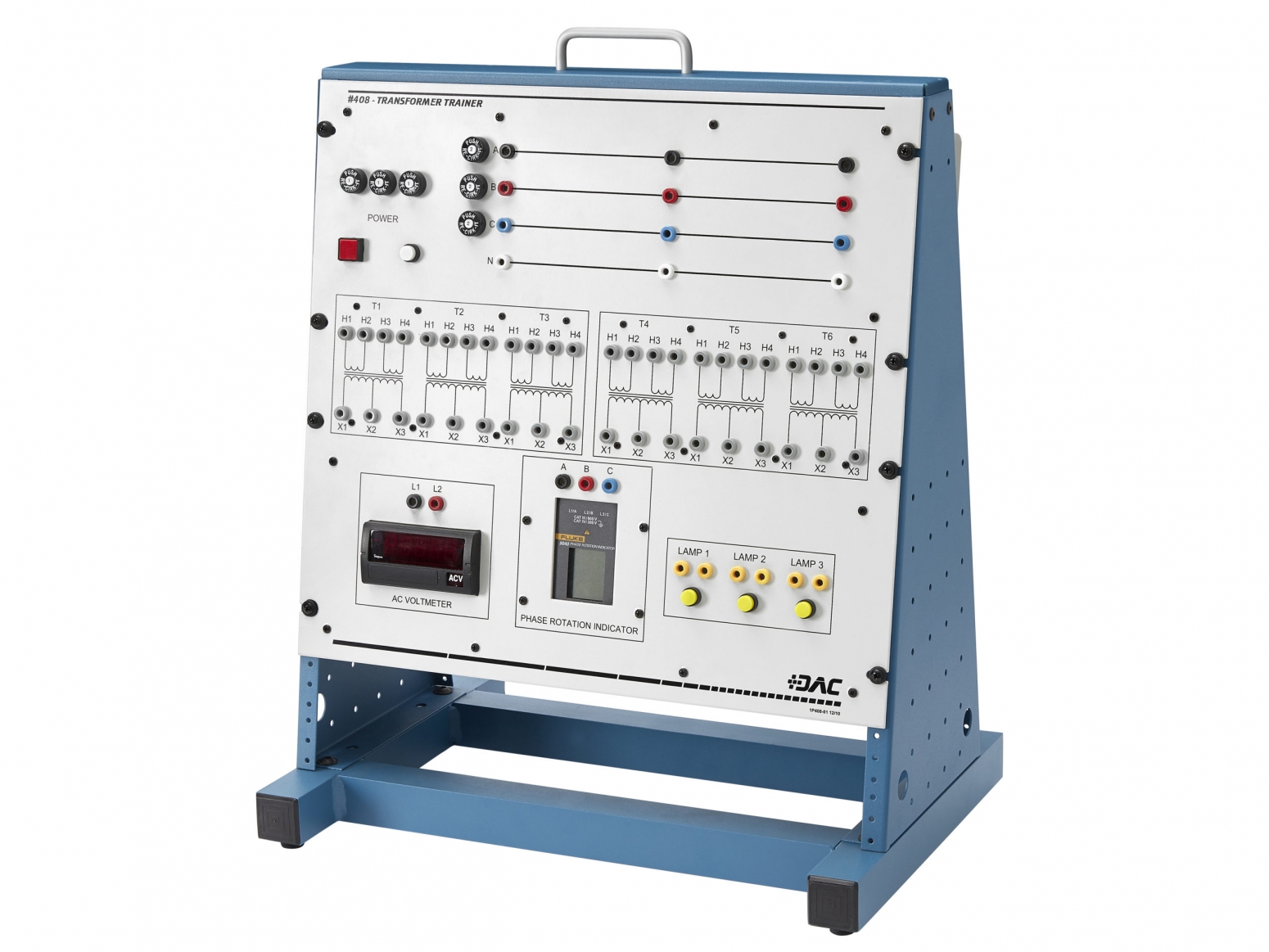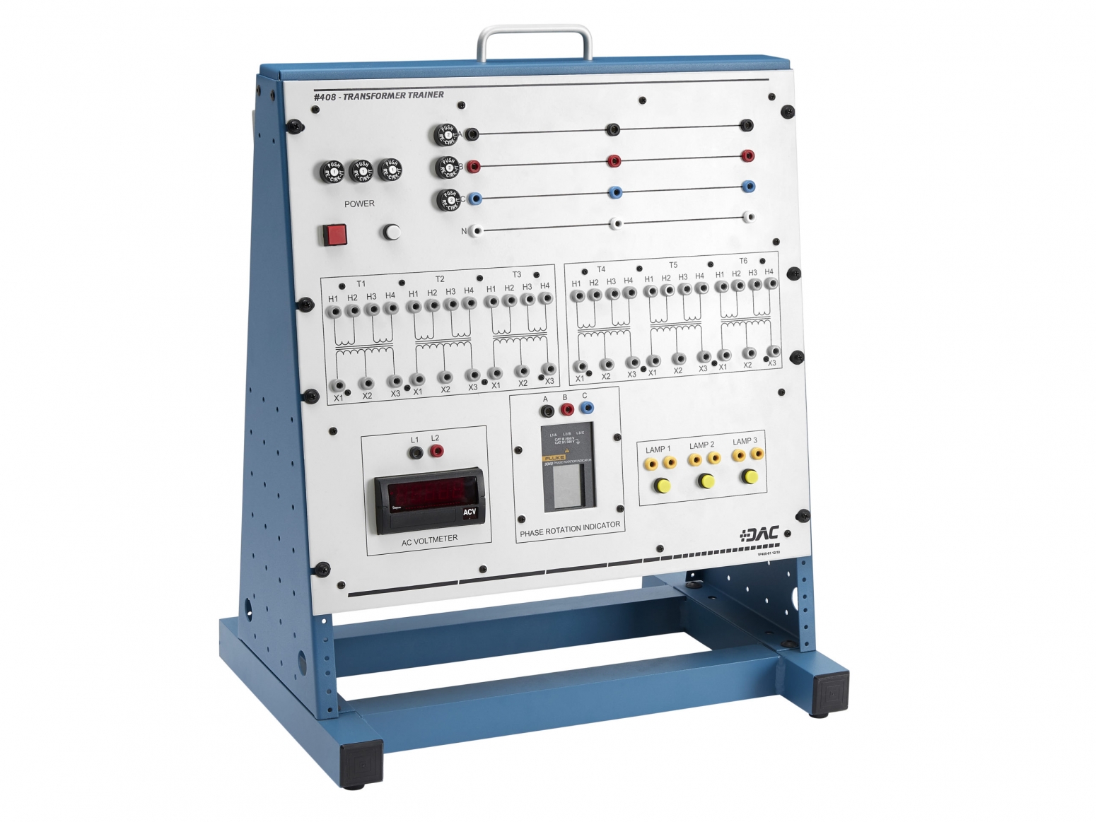 DAC Worldwide’s Transformer Wiring Training System (408-000) is a realistic training device that replicates the conditions and circumstances that an electrical worker encounters when making common power transformer connections in the field and industry. This self-contained, tabletop training system provides a safe, inexpensive, yet realistic alternative to paper-based learning without the danger of full-voltage field experience.