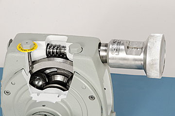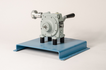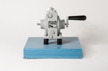 This example, procured as industrial surplus, has been restored, cutaway, and refinished using durable coatings. The device is mounted on a modular, heavy-Gauge steel baseplate and support assembly. For industrial relevancy, common models, by well-known manufacturers are chosen. All examples can be mounted on related DAC bench, workstation, and storage products. All operational features have been retained allowing the reducer to be operated via hand crank and replacement hardware has been provided where necessary.